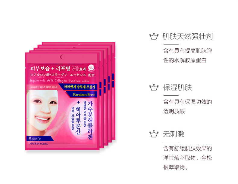 - 含有具有保湿功效的透明质酸、提高肌肤弹性的胶原蛋白, 本品是一款护理肌肤效果显著的产品。 本品是一款无添加对羟基苯甲酸酯、对肌肤的刺激降到最低的产品。 含有富含维生素C的西柚萃取物、具有舒缓肌肤效果的洋甘菊萃取物、金松根提取物。 一款从树木中萃取的纤维面膜, 吸收功效显著,无刺激性,适用各类肌肤。 面膜用完后不需要洗脸。