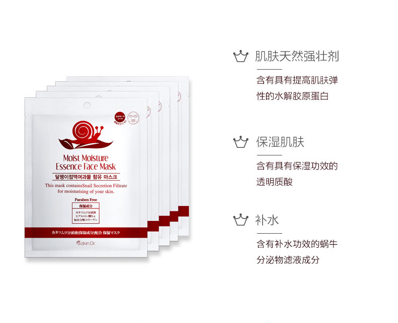 - 含有具有保湿功效的透明质酸、提高肌肤弹性的水解胶原蛋白 以及补水功效极高的蜗牛分泌物滤液成分(黏蛋白MUCIN), 本品是一款肌肤护理效果显著的产品。 含有富含维生素C的西柚萃取物、蜂蜜,修复疲惫的肌肤。 本品是一款无添加对羟基苯甲酸酯、对肌肤的刺激降到最低的产品。 帮助接受面部美容手术的人快速恢复。 一款从树木中萃取天然成分的纤维面膜, 吸收功效显著,无刺激性,适用各类脆弱肌肤。 补水保湿,面膜用完后不需要洗脸。